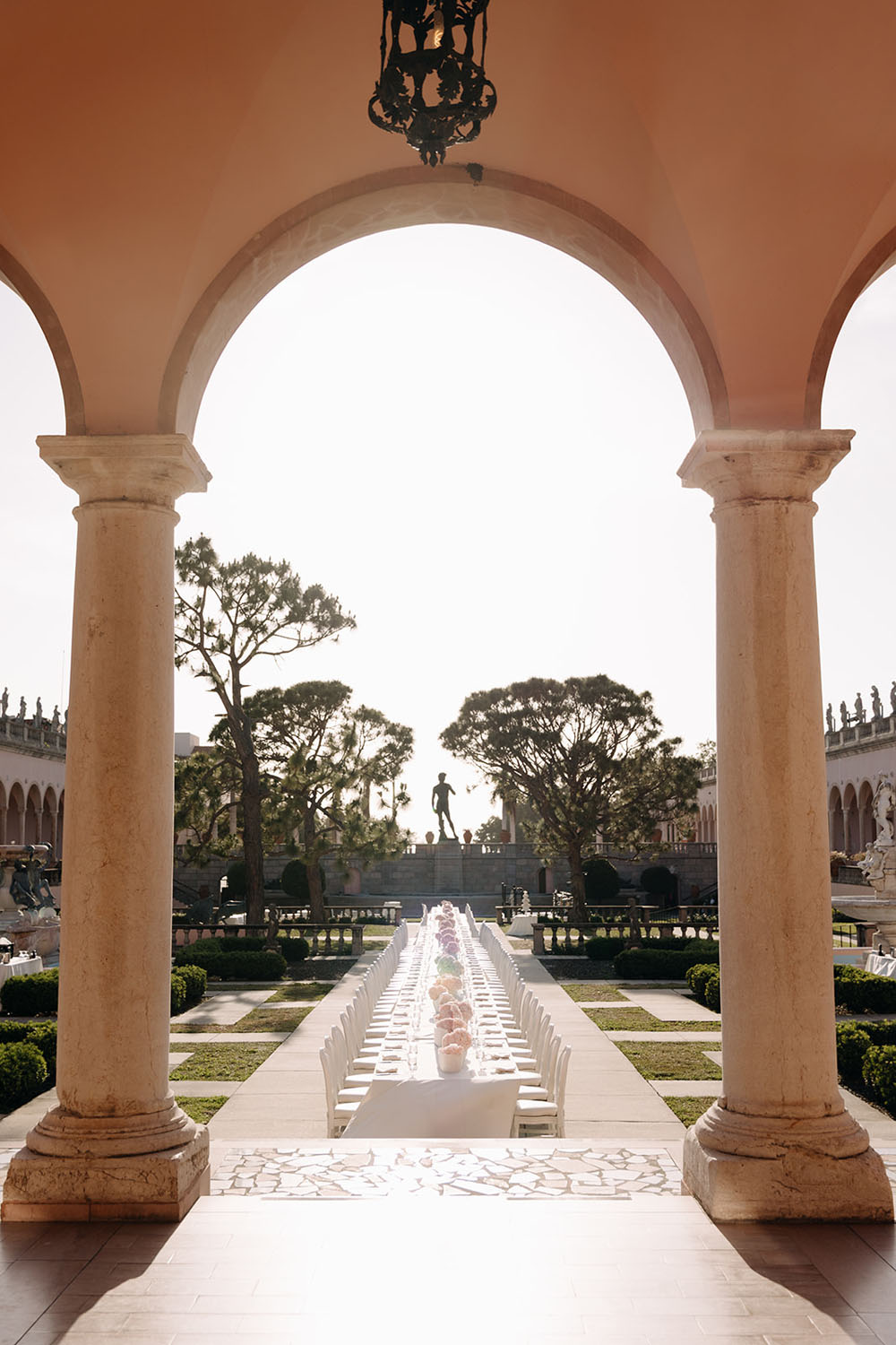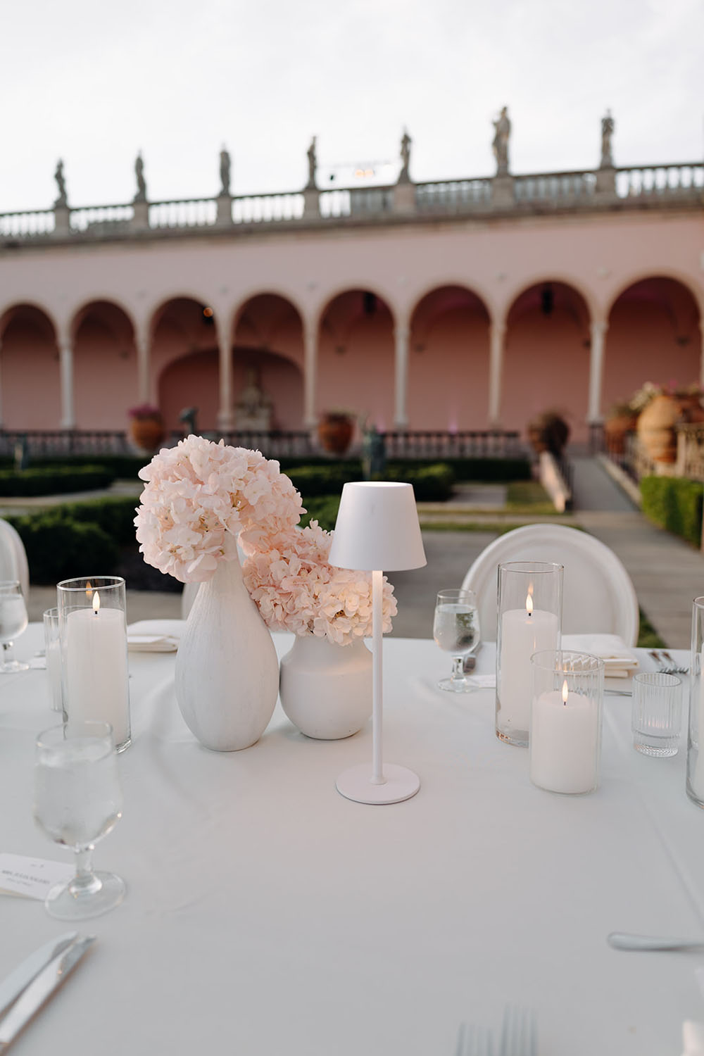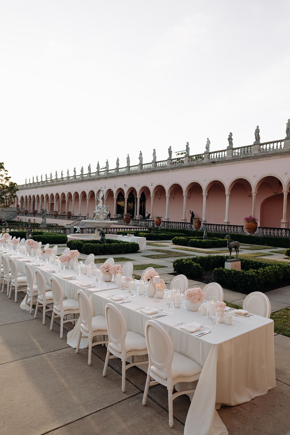 All-white tables, chairs, and place settings with just hints of blush in the florals looked right at home at The Ringling.