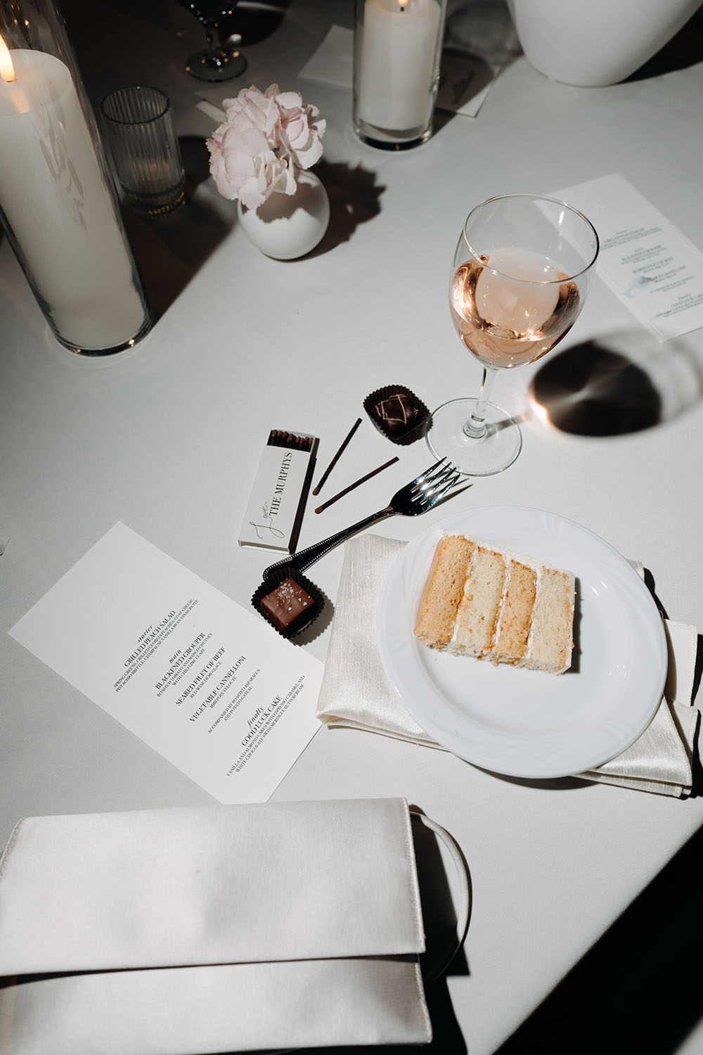 A few money-saving moves included creating their signature cocktails out of ingredients they knew were already stocked behind the bar, DIY programs and dinner menus, and chocolates as favors sprinkled throughout the venue so guests could treat themselves them or stash away for later.
