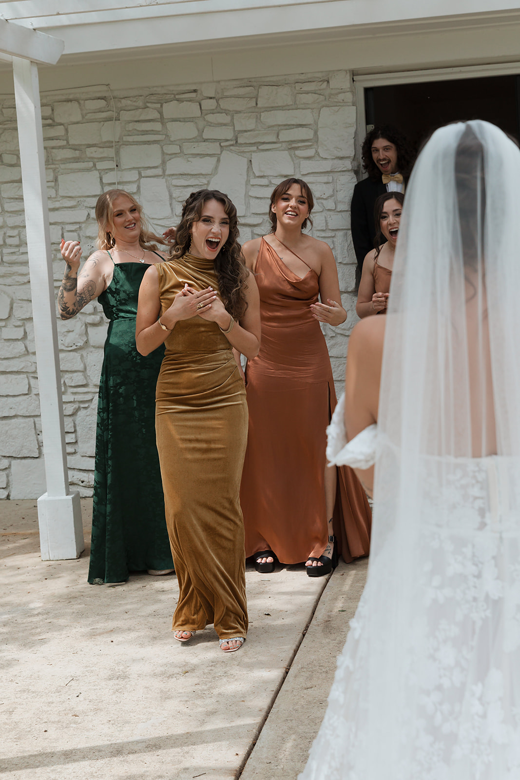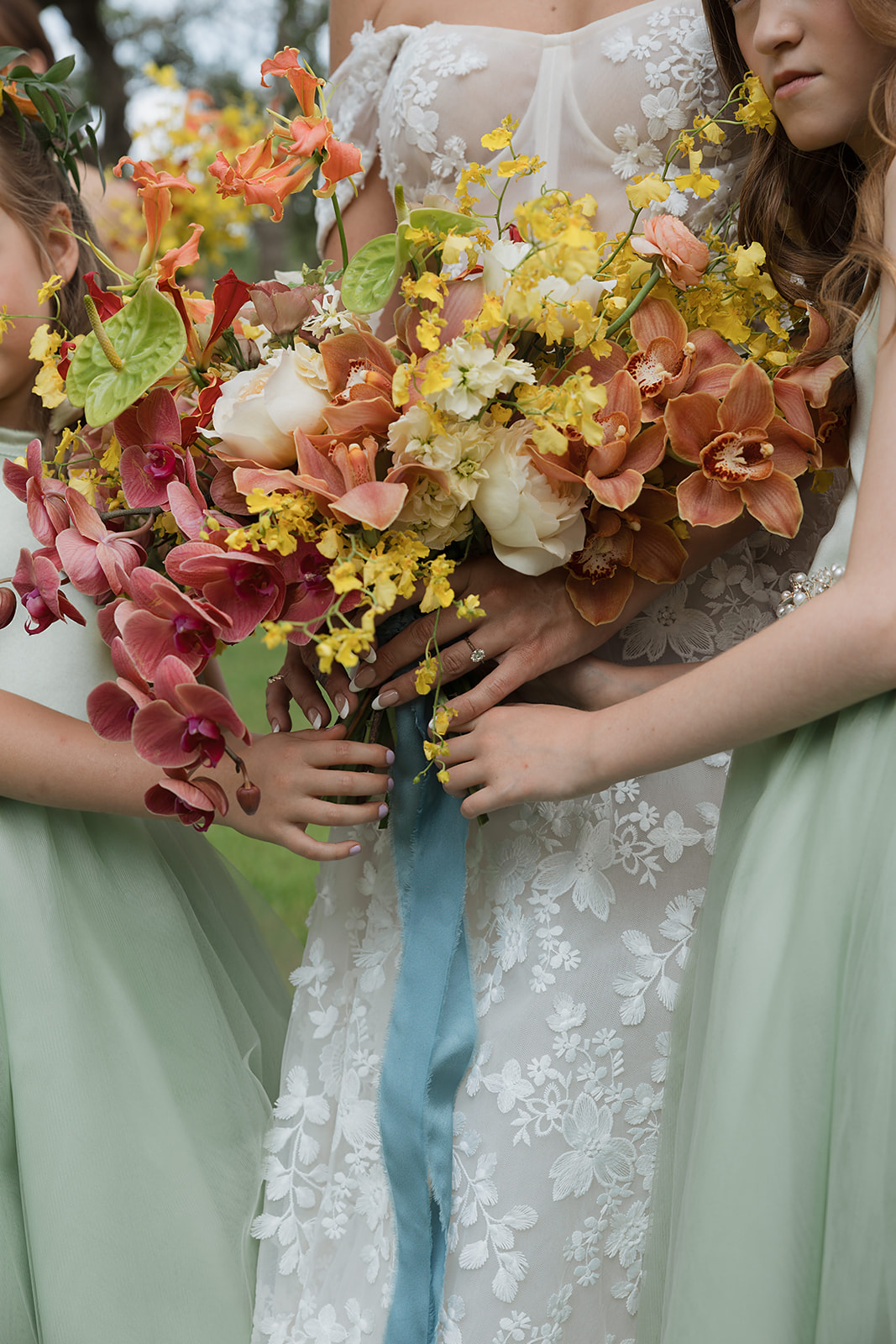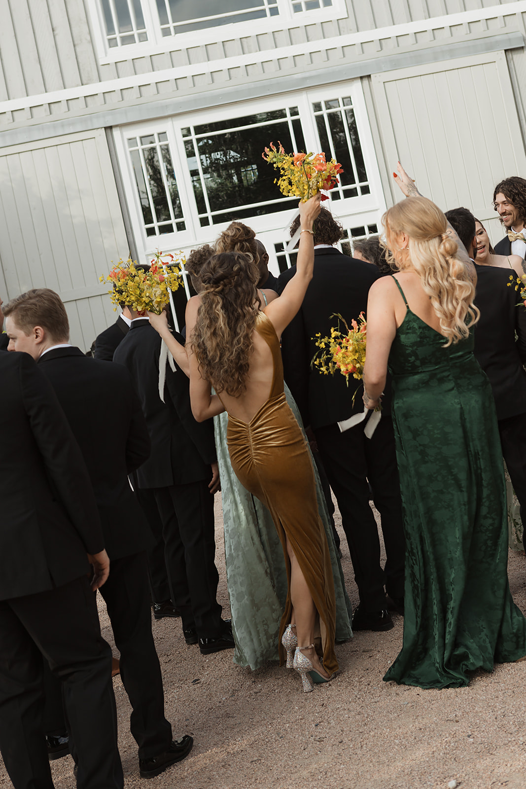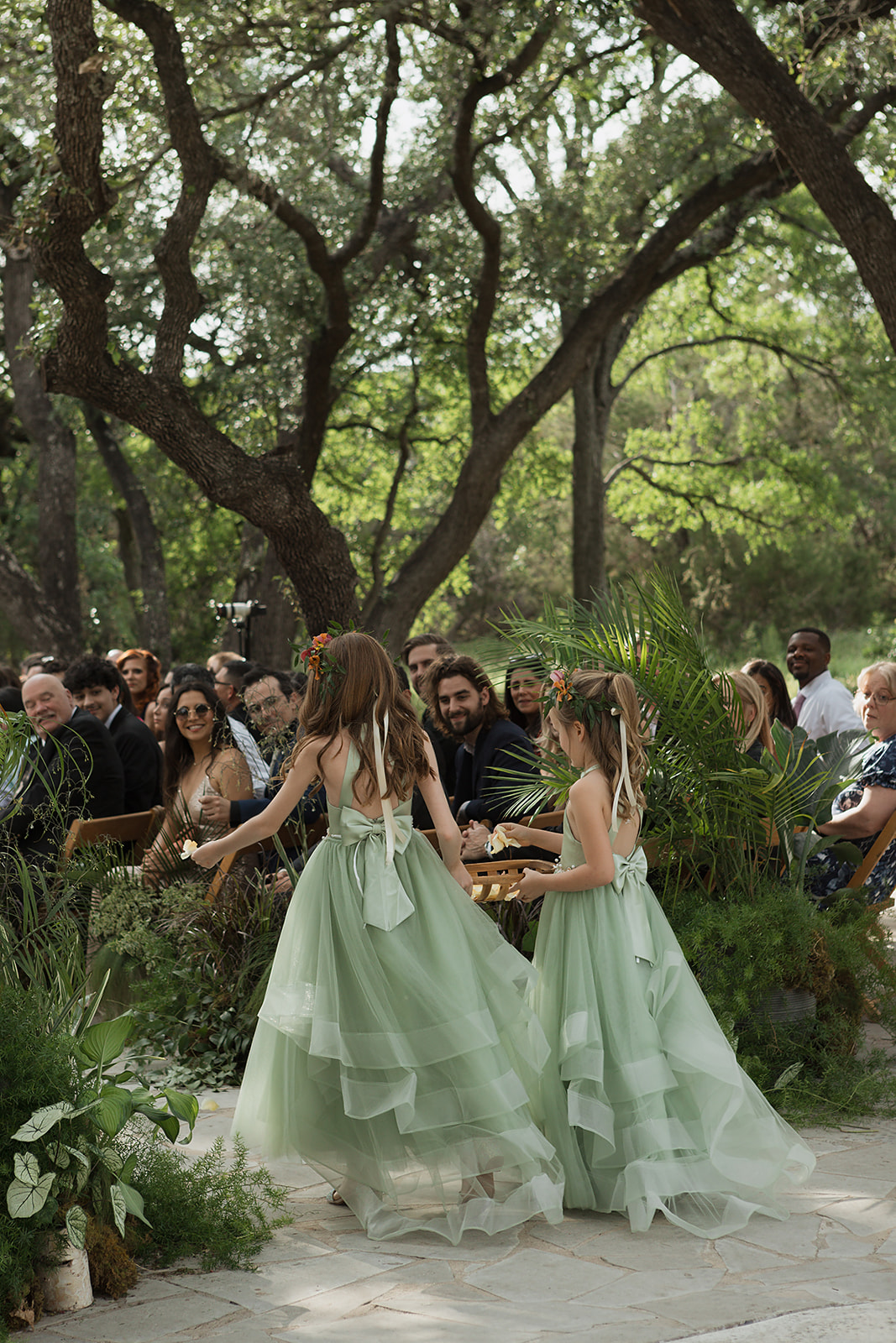 And Taylor’s bridal look? Jaw. Dropping. She wore a showstopping Eisen Stein gown that struck the perfect balance between ethereal and editorial. Her bridesmaids were styled in a perfectly mismatched palette of greens and rust, while the flower girls twirled down the aisle in seafoam green with playful flower crowns. It all felt like a dream pulled from a 1970s botanical art book with a modern twist.