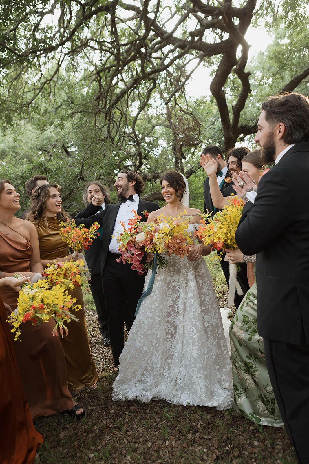 Taylor and Drake are a stylish, fun-loving couple who never shy away from a creative challenge. (In fact, they were all about adding some funky details here and there.) So when it came time to say I Do, their friends and fam knew they were guaranteed an unforgettable experience. Set beneath the sweeping oak trees of The Addison Grove just outside Austin, T + D’s May wedding was a masterclass in floral expression, personal style, and throwing a joyful, offbeat party with heart. The florals by 100 Layer Cake Guide Member Wild Bunches Floral, and captures by Light as Gold, prove just what a dreamy day it all was.