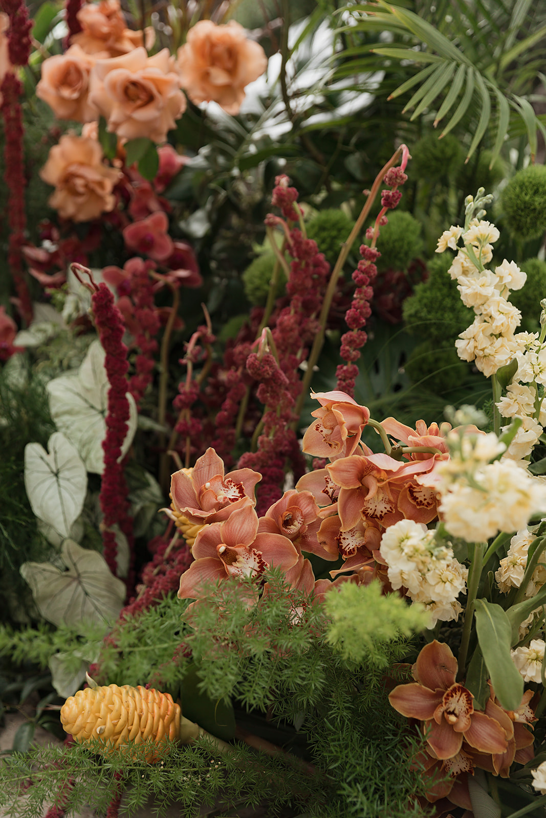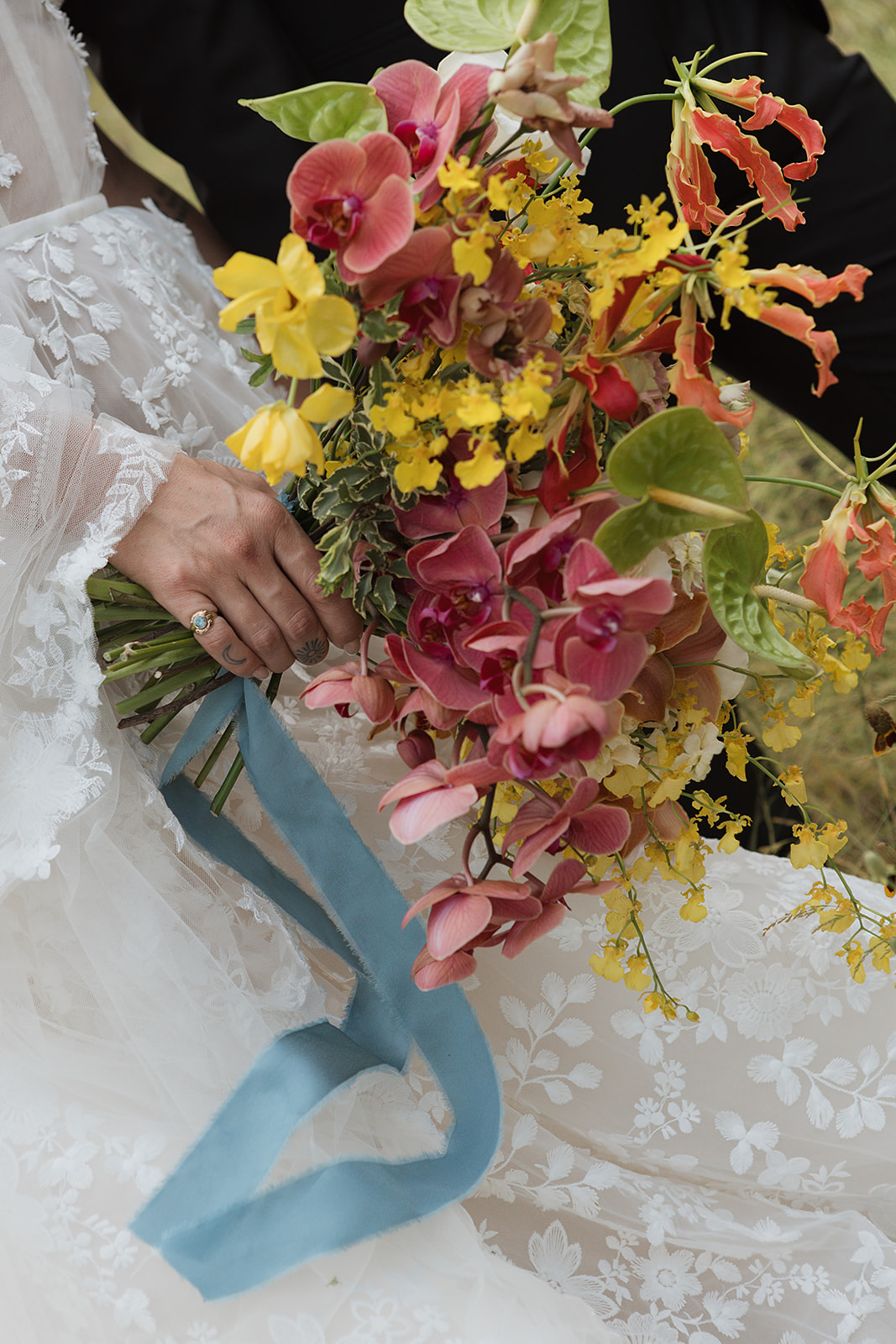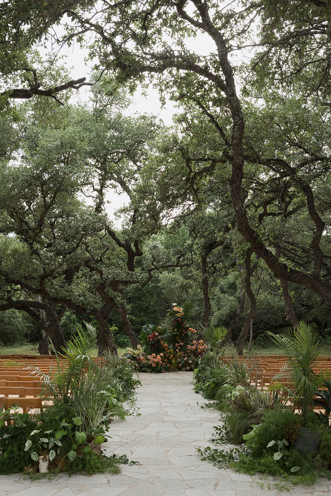 Inspired by Taylor’s love for sculptural, non-traditional blooms, their floral design was anything but expected. Picture gloriosa lilies, protea, orchids, and tropical stems dancing together in wildly organic arrangements that felt more like modern art than florals. The aisle was flanked with a lush mix of tropical and local greenery, guiding guests toward a ceremony backdrop that channeled an overgrown garden—deliberately funky, slightly wild, and totally magical.