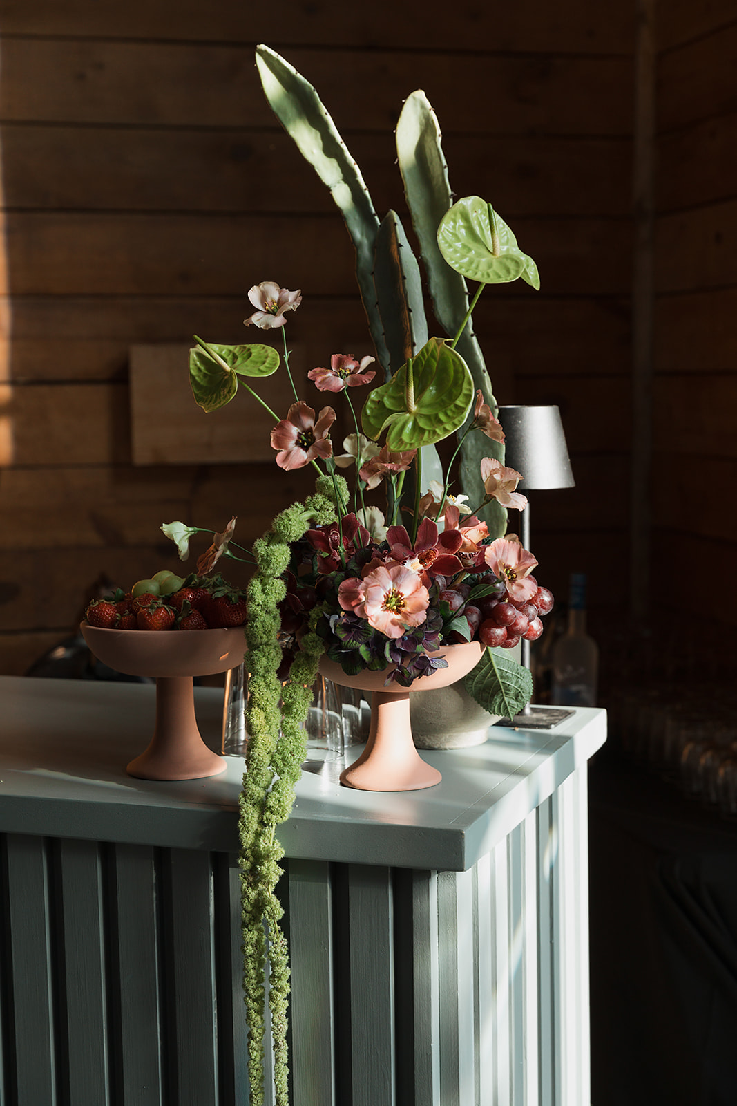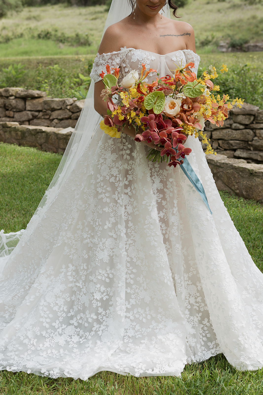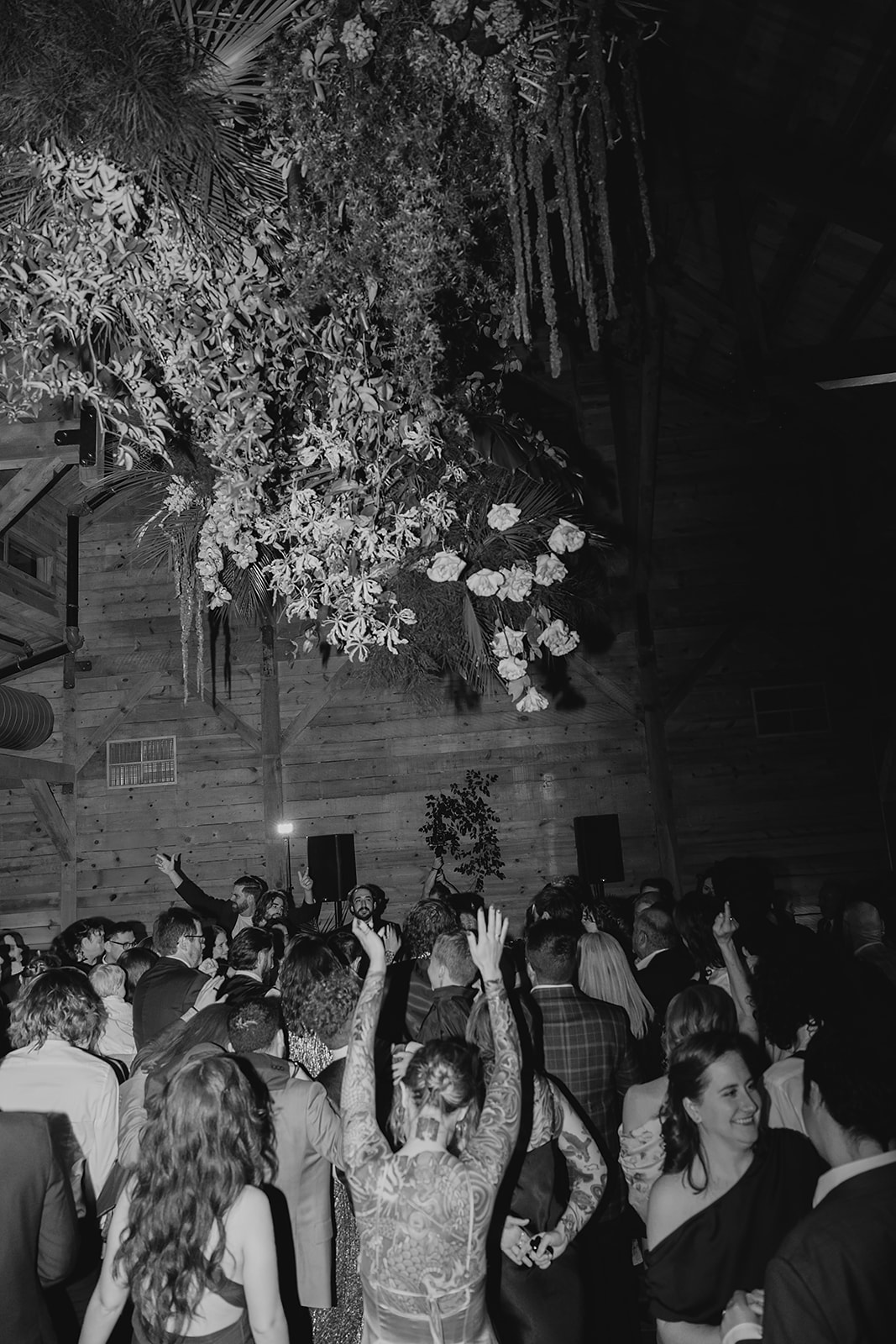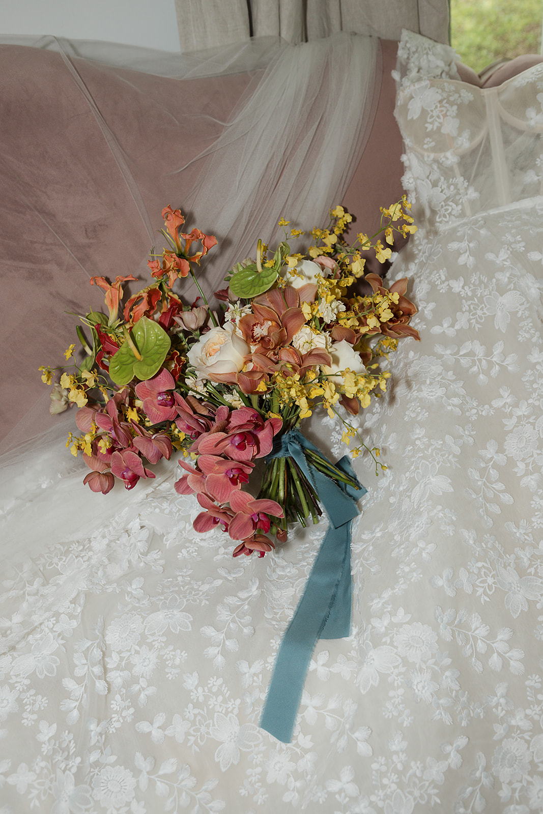 Inspired by Taylor’s love for sculptural, non-traditional blooms, their floral design was anything but expected. Picture gloriosa lilies, protea, orchids, and tropical stems dancing together in wildly organic arrangements that felt more like modern art than florals. The aisle was flanked with a lush mix of tropical and local greenery, guiding guests toward a ceremony backdrop that channeled an overgrown garden—deliberately funky, slightly wild, and totally magical.