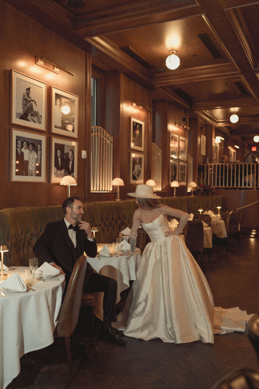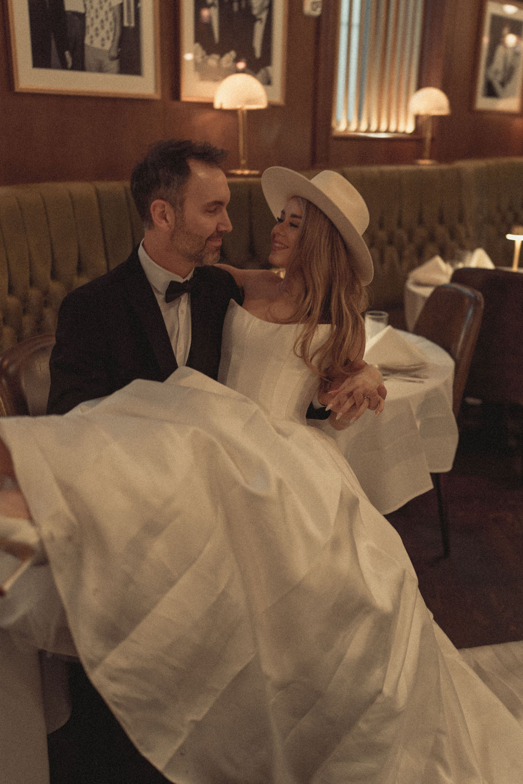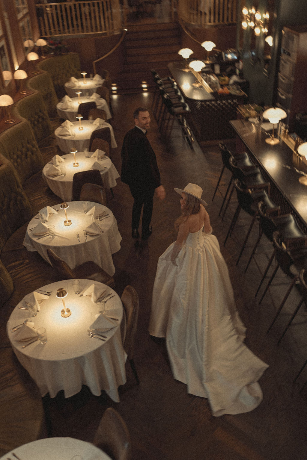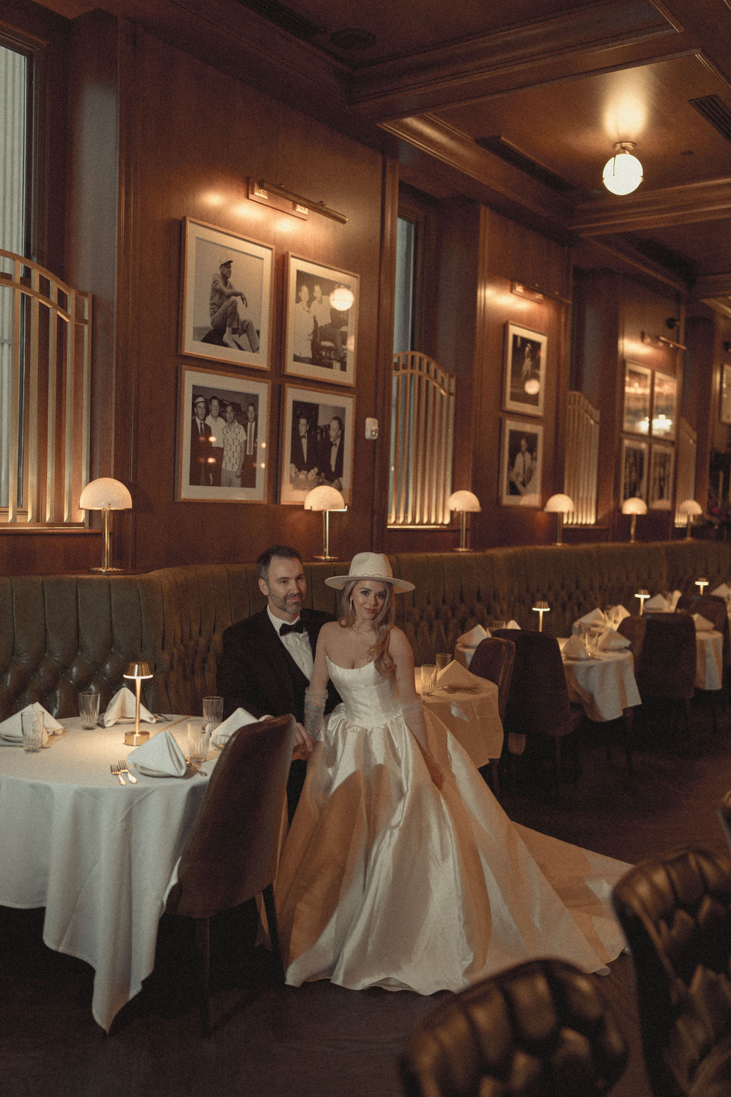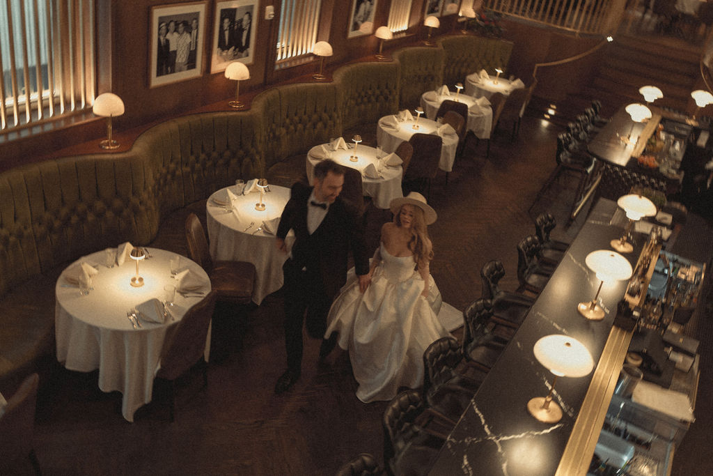 This isn’t your average “I do.” Set against the moody, intimate backdrop of Hemingway, one of Nashville’s most stylish bars, this chic elopement shoot blends fashion-forward vibes with a dash of retro flair. Think a tailored suit, a statement gown, bold accessories, and cocktails that match the couple’s effortlessly cool energy.
