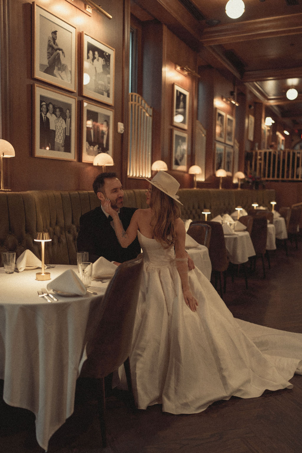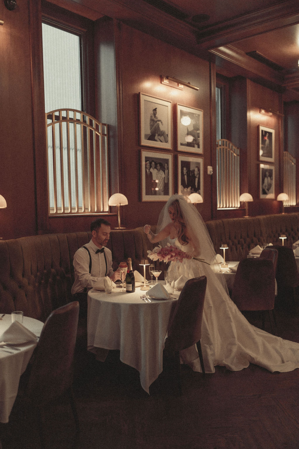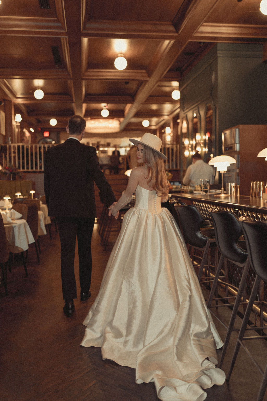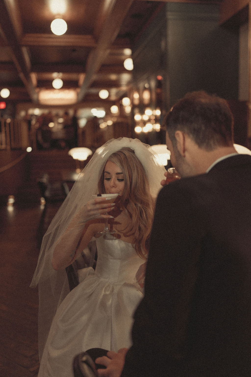 This isn’t your average “I do.” Set against the moody, intimate backdrop of Hemingway, one of Nashville’s most stylish bars, this chic elopement shoot blends fashion-forward vibes with a dash of retro flair. Think a tailored suit, a statement gown, bold accessories, and cocktails that match the couple’s effortlessly cool energy.