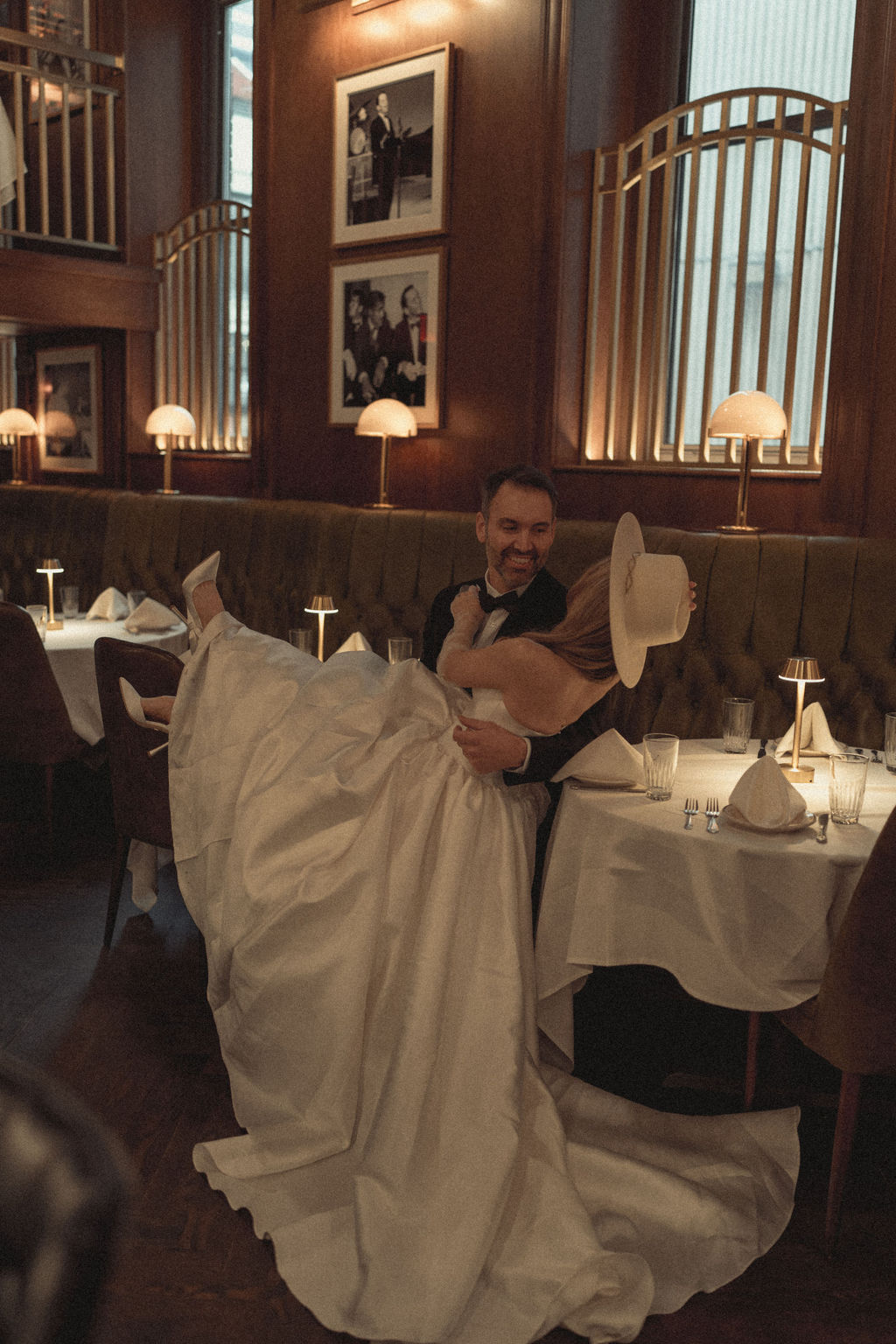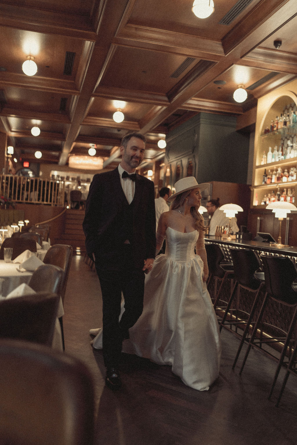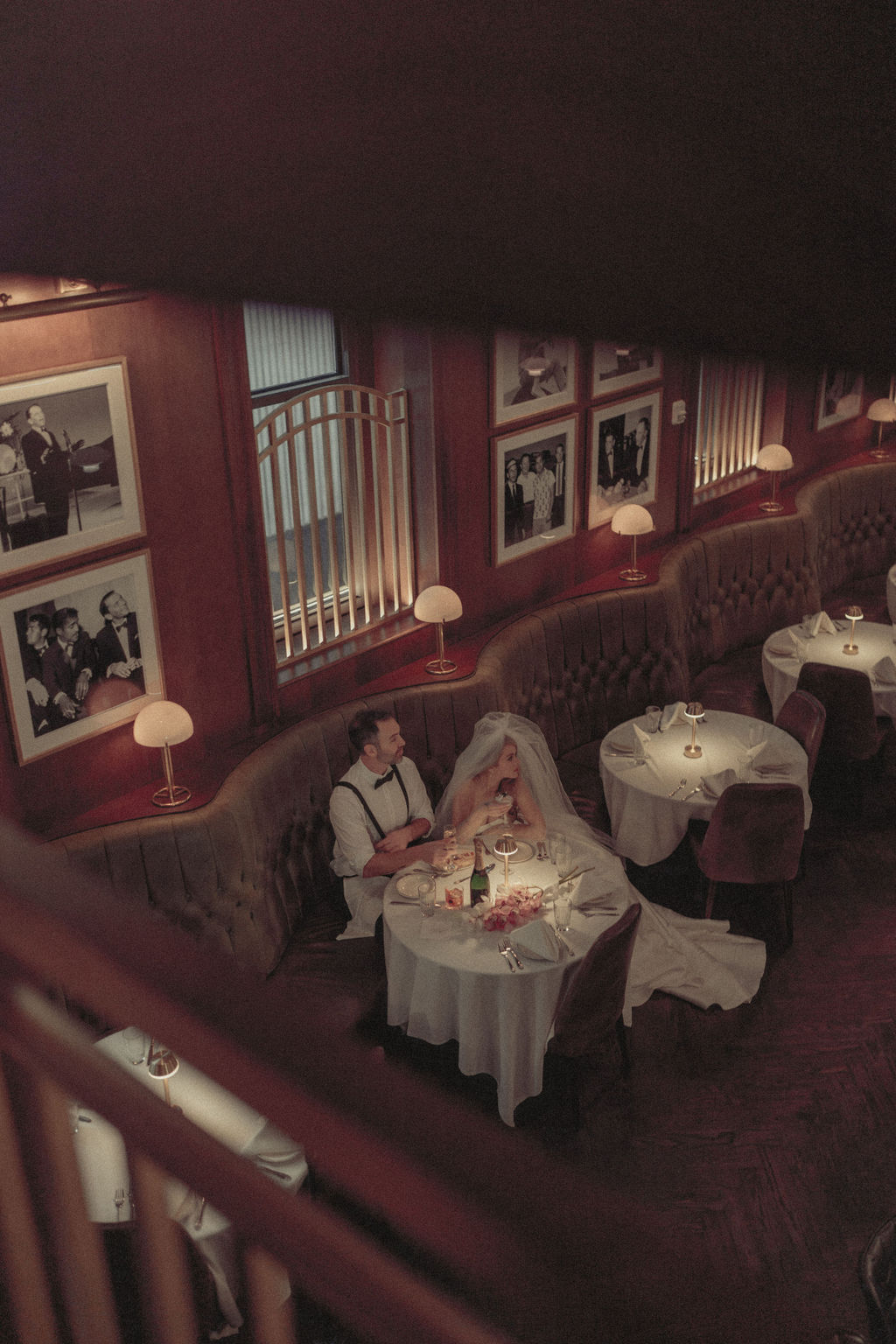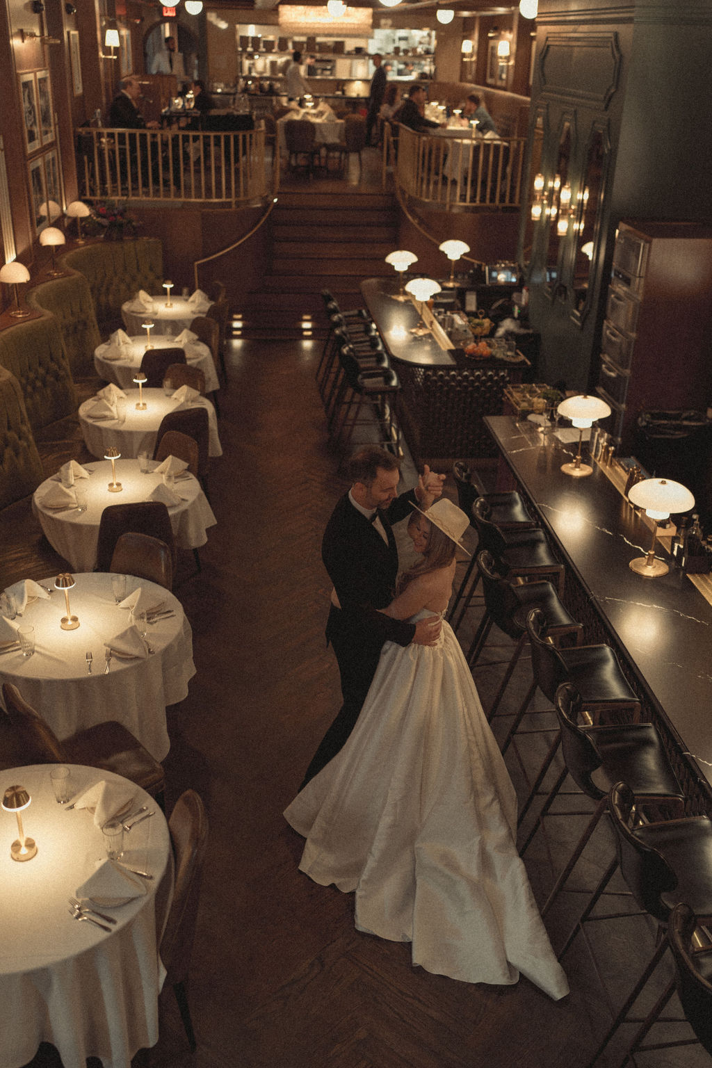 This isn’t your average “I do.” Set against the moody, intimate backdrop of Hemingway, one of Nashville’s most stylish bars, this chic elopement shoot blends fashion-forward vibes with a dash of retro flair. Think a tailored suit, a statement gown, bold accessories, and cocktails that match the couple’s effortlessly cool energy.